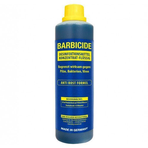 - 500 ml pullosta saat noin 30 litraa käyttövalmista nestettä, kun sekoitat sen veden kanssa suhteessa 1:16. Se on tehokas jo 10 minuutin vaikutusajalla ja tappaa tehokkaasti kaikki bakteerit, virukset ja sienet. Barbicide sopii kaikille vedenkestäville välineille ja materiaaleille, mukaan lukien muovi, metalli ja akryyli. Sitä voidaan käyttää myös ultraäänipesurissa.